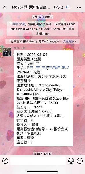 出國前有先拉了一個微信群組並有詳細的接送資訊除了讓司機一目了然 也可以確認行程安排是否有誤